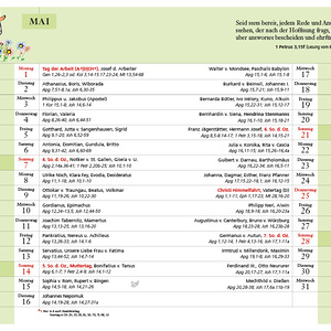 • ausführliches Monatskalendarium mit Namenstagen, Tageslesungen und Platz für Notizen