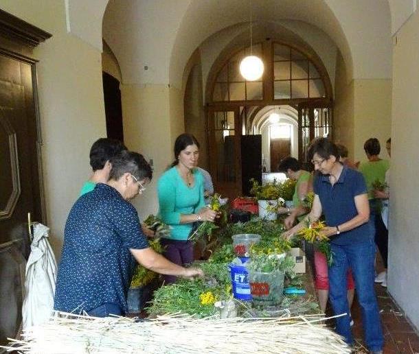 Kräuterbüschelbinden im Klostergang am 14. August 2018