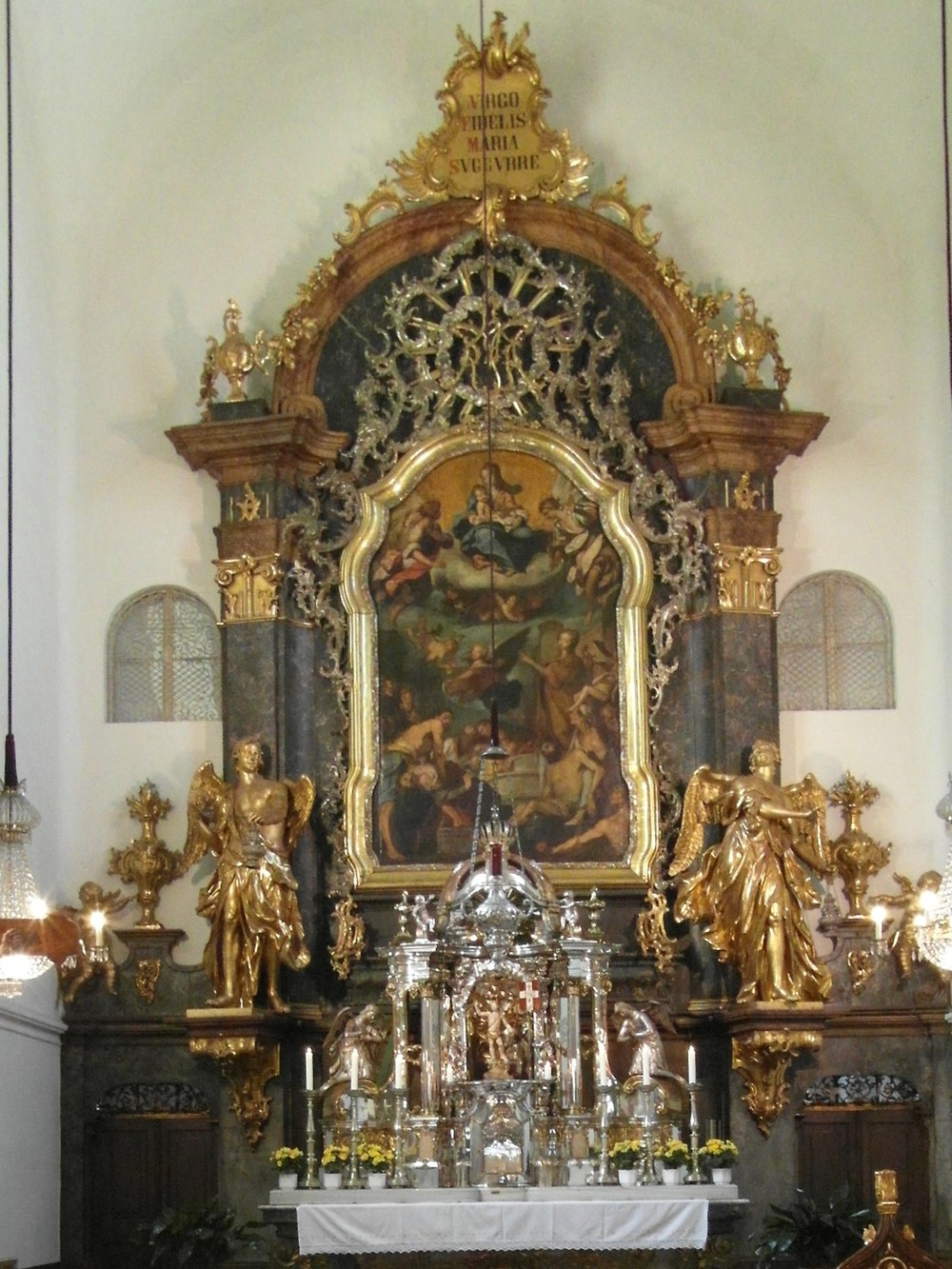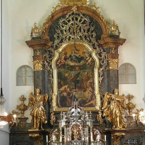 Der wohl anlässlich der Umgestaltung der Kirche 1769 entstandene Hochaltar stellt den Zielpunkt des Kirchenraumes dar. Das Marmorretabel ist über Opfergangportale, auf denen sich vergoldete Vasen erheben, mit den seitlichen Chorwänden verbunden. Die auf Konsolen zuseiten des Altarblattes stehenden Engelfiguren mit Weihrauchfass entstanden um 1769 und werden dem Bildhauer Philipp Jakob Straub zugeschrieben, dem Schöpfer der Fassadenskulpturen.