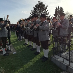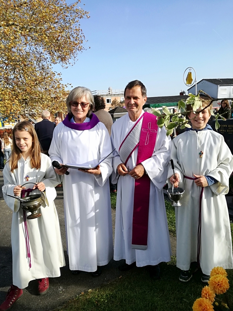 Bei strahlendem Herbstwetter nahmen zu Allerheiligen viele Menschen an der Feier auf unserem Friedhof teil. Mit berührenden Texten vermittelten Christa und Diakon Franz Habith den FriedhofbesucherInnen die zentrale Hoffnung unseres christlichen Glaubens, dass unsere lieben Verstorbenen neues Leben bei Gott erwarten dürfen. Die Namen der im letzten Jahr Verstorbenen wurden vorgelesen. Musikalisch wurde die Feier von der MUZ festlich umrahmt. Nach der Gräbersegnung boten unsere Minis ihre selbst gebackenen Allerheiligenstriezerl an. Danke für die freiwilligen Spenden!