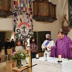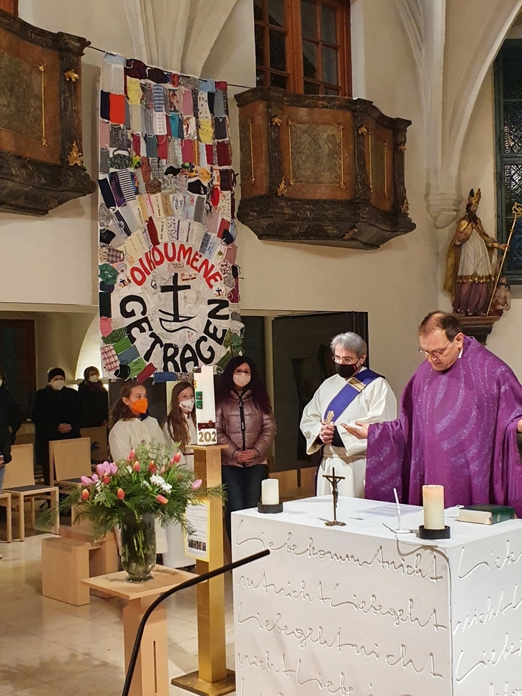 Wir sind von Gott getragen - in der Pandemie und anderen Nöten des Lebens! Diese zentrale Botschaft des ökumenischen Getragen-Tuches, das bis Mitte März in unserer Kirche zu betrachten ist, wurde beim Aschermittwoch-Gottesdienst von Vikar Gerhard Hatzmann und Birgit Zepf sehr schön erläutert. Getragen-Tuch und Aschenkreuz – zwei starke Symbole zu Beginn der Fastenzeit!