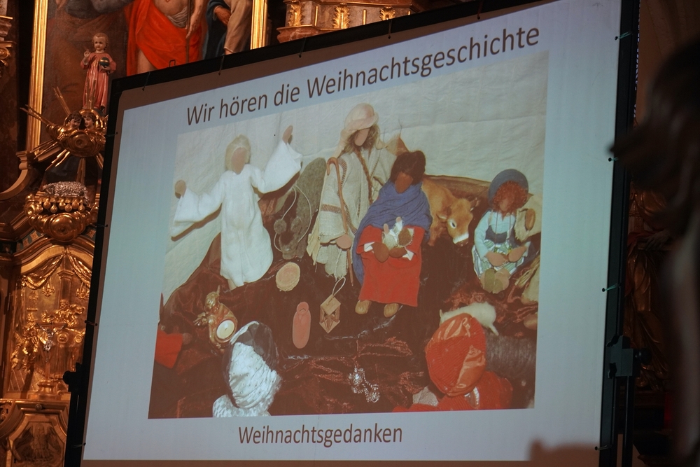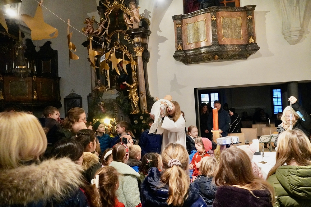 Mit vielen Kindern, Eltern und Großeltern feierte Wort-Gottes-Feier-Leiterin Anja Asel am Nachmittag des Heiligen Abends in unserer weihnachtlich geschmückten Kirche die Geburt des Jesuskindes. Die Feier wurde von unserer „Kirchenband“ mit wunderbaren Weihnachtsliedern musikalisch gestaltet. Begeistert sangen Groß und Klein mit und man spürte die Freude aller, am „Geburtstagsfest des Jesuskindes“ teilzunehmen.